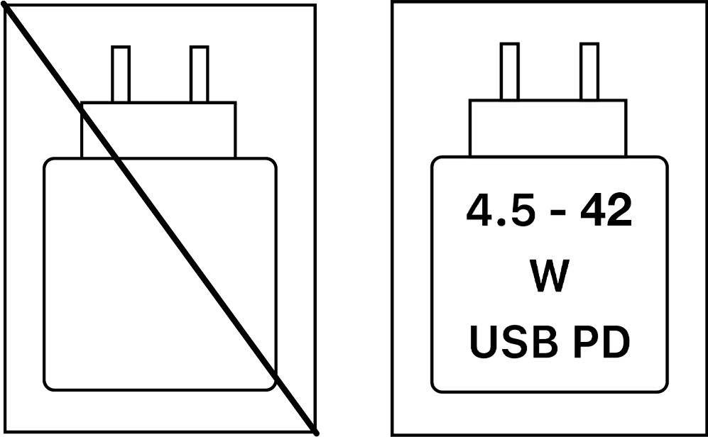 Lauturi ei sisälly tuotteeseen. Laitteeseen sopii laturi, jonka latausteho on vähintään 4.5 W. Laitteen suurimman latausnopeuden saavuttamiseksi laturin lataustehon on oltava vähintään 42 W. Laite tukee USB PD -pikalatausta.